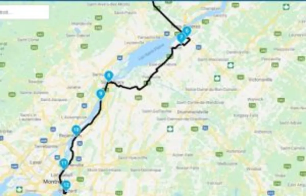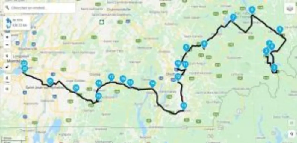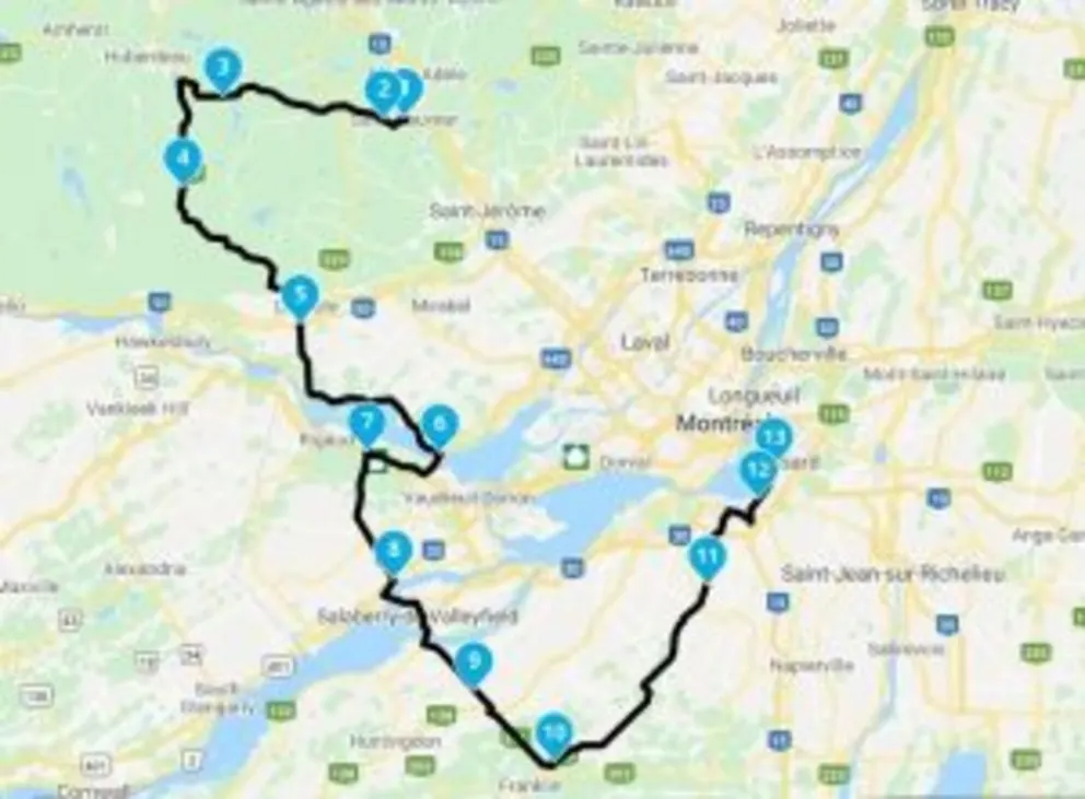 Départ de l’hôtel Cache du golf à Beauceville, direction St-Victor (peut-être un petit arrêt à L’Hotel Route 66 - resto). Suivre la route pour se rendre à Thedford Mines, ensuite direction du Lac William à St-Ferdinand, Plessiville, Princeville, Warwick tout en se rendant dans la vallée de Tingwick et de Danville, petit détour vers St-Félix de Kingsey tout en continuant vers la rivière St-François et la longer vers Richmond au centre-ville pour prendre le vieux pont en métal pour se diriger vers Racine, Laurenceville, Warden, le parc National de la Yamaska et se diriger vers Richelieu pour ensuite suivre la route pour se rendre à Brossard chez Léo Harley-Davidson.